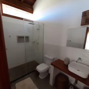 Acrescido a isso tudo, ainda há um chalé anexo, que também segue o mesmo padrão da casa principal e conta com uma pequena cozinha completa com uma linda bancada e pia em madeira cumaru, uma saleta e uma suite com pé direto alto. O piso é em cimento queimado igual a casa principal e esquadrias em madeira e ar condicionado.