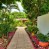 Jardim espaçoso, com 5 mesas com 4 cadeiras e sombreiros, e chuveirão